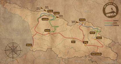 Z powodu nieprzystępności zwiedzanych obszarów niemożliwe jest spędzenie każdej nocy w domach gościnnych. Podczas 3 nocy będziemy spać we własnych namiotach w obozowiskach. W Tbilisi będziemy zakwaterowani w hotelu (ze śniadaniem). Przy każdym noclegu w domach gościnnych (5x) w cenie zapewnione są kolacja i śniadanie. Pozostałe wyżywienie we własnym zakresie.