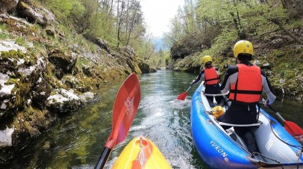 Rano zbiórka ok godz. 9:00. Wydajemy Wam sprzęt osobisty i ruszamy na start pierwszego odcinka. Przed rozpoczęciem spływ każdorazowo prowadzimy wyczerpujące i szczegółowe szkolenie dotyczące techniki pływania i procedur bezpieczeństwa. Zbieramy się na plaży, ok. 200 metrów od wypływu rzeki Savy. Po wpłynięciu na rzekę, niemal od razu odkrywamy przepiękny kanion, rzeka zwęża się do kilku metrów i przyspiesza. Za kanionem jej nurt z nowu staje się bardziej leniwy, ale atrakcji dostarczają liczne (bezpieczne) progi z naturalnych kamieni. Po południu proponujemy Wam wycieczkę szlakiem pod wodospad Savica.