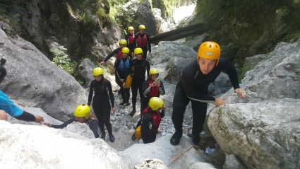 Sobotę rozpoczniemy od pieszej wycieczki wąwozem Wasserloch (10:00-13:00; to atrakcyjny widokowo, dobrze przygotowany, acz stromy szlak wiodący przez liczne wodne kaskady i wodospady, miejscami usprawniony drewnianymi mostkami i schodami. Wspiąć można się aż na sam szczyt, skąd roztacza się przecudny widok na całą dolinę. Następnie kontynuujemy naukę manewrów wejścia i wyjścia z cofki, wprowadzamy powoli nowe manewry. Uczymy się także - wykorzystując wiedzę z wczorajszego wykładu - identyfikować zjawiska na rzece i omijać przeszkody.Zapoznajemy się także z podstawowymi technikami asekuracji. Cieszymy się z rosnących postępów:)