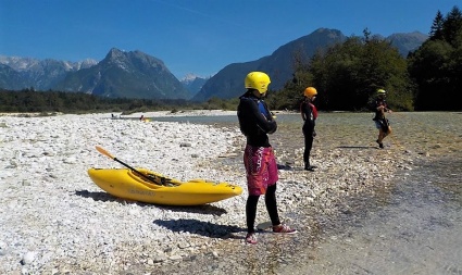Rano ok. 9:30 spotykamy się na wspólnym przywitaniu i wydaniu sprzętu osobistego: pianki, butów, kasków i kamizelek. Dziś stawiamy pierwszy kroki na wodzie. Uczymy sie wsiadania i wysiadania, a także utrzymania równowagi w kajaku i płynięcia na wprost po stojącej wodzie, a także poprawnego opuszczania kajaka po wywrotce:). Płyniemy też oczywiscie nasz pierwszy odcinek rzeki Soca. Po południu wykład nr 1 - wprowadzenie do kajakarstwa górskiego.
