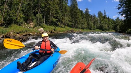 Początkowo Salza płynie spokojnie, pozwalając nam przyzwyczaić się do sprzętu, już jednak po niecałym kilometrze rozpoczynają się pierwsze bystrza i fale. Na naszej drodze dziś wiele przygód, długich bystrzy, małych progów skalnych i uroczych zatoczek (cofek), zachęcających do kąpieli wpław. Naszym celem jest nauka poprawnego wchodzenia do cofek i wychodzenia na naurt. Około godz. 16:00-17:00 wrócimy na kemping.