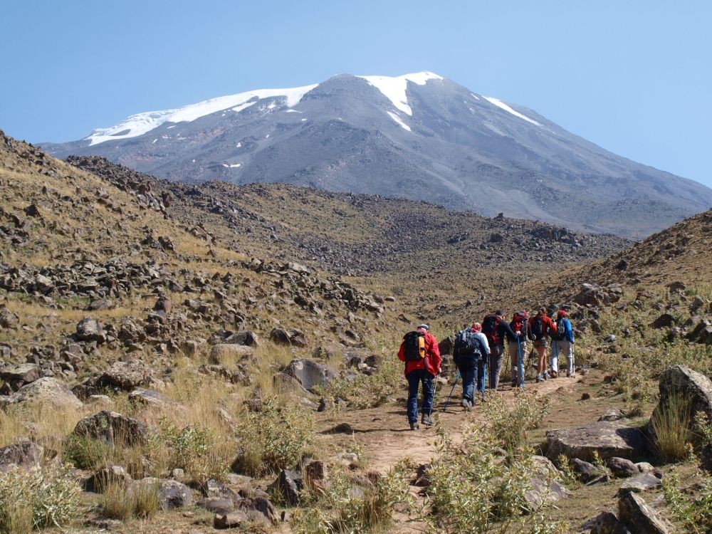 Wyprawa górska na pięciotysięcznik. Nie ma trudności technicznych i wędrujemy na lekko. Wymagana dobra kondycja. Na ataki szczytowe wyruszamy w nocy. W kopule szczytowej Araratu chodzimy w rakach.