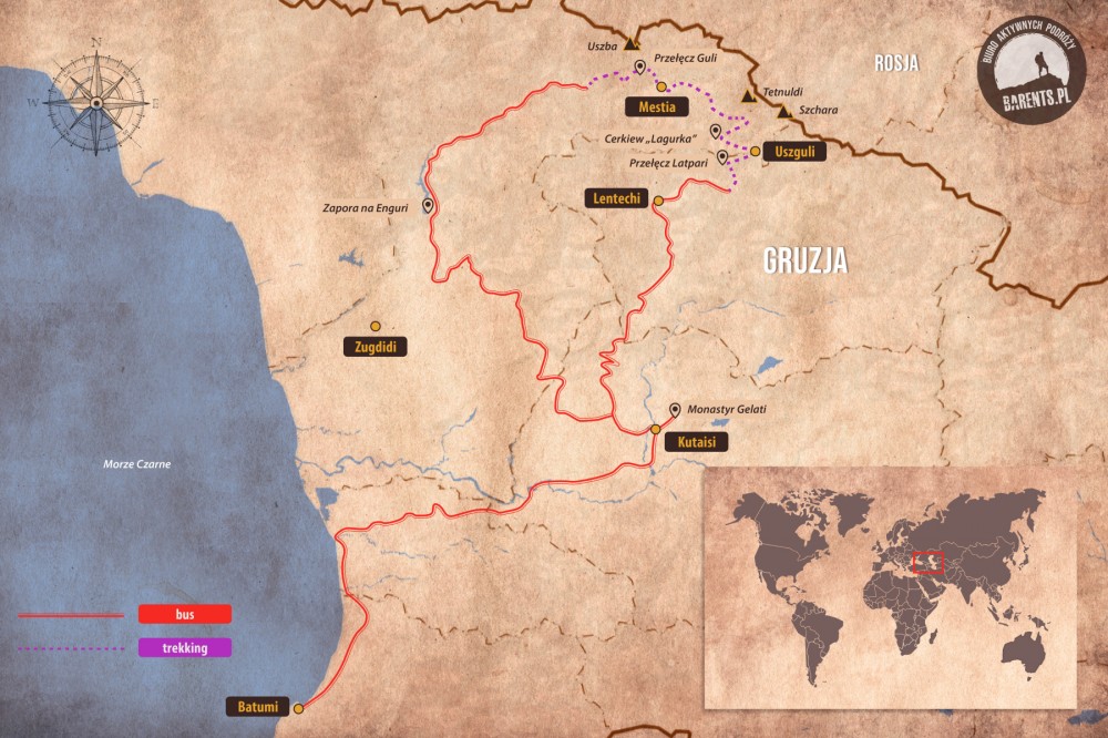 *W przypadku zalegającej na trasie z Mazeri do Mestii pokrywy śnieżnej możliwy alternatywny trekking z Mestii do jezior Koruldi.