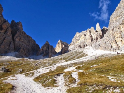 Podejście doliną pomiędzy grupami Marmarole i Sorapiss na przełęcz Forcella Grande (2255 m n.p.m.).