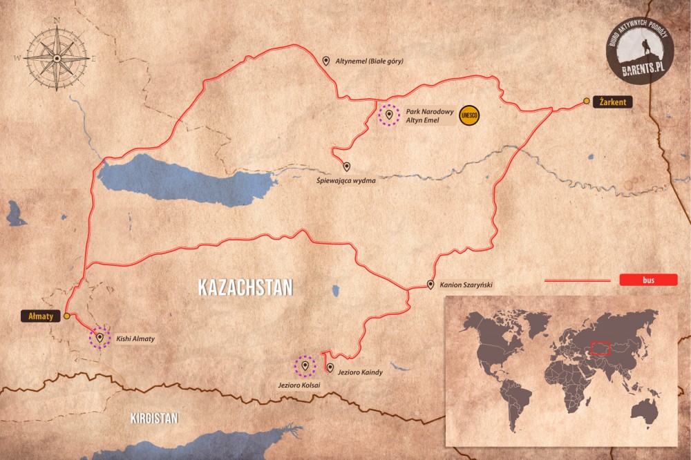 Wycieczka do Kazachstanu! Podczas wycieczki do Kazachstanu zobaczymy prawdziwe cuda przyrody - Park Narodowy Ałtynemel (UNESCO) z niesamowitymi Górami Aktau i słynnymi śpiewającymi wydmami. Jeziora Kolsai, las zatopiony w Jeziorze Kaindy, ośnieżone szczyty Tien-Shanu i jego głębokie doliny dostępne z Ałmatów na wyciągnięcie ręki.