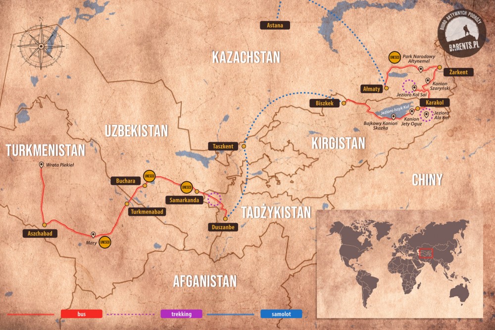 Jest to aktywna objazdówka. Będziemy zwiedzać atrakcje przyrodnicze i miasta Uzbekistanu, Kirgistanu, Kazachstanu, Turkmenistanu i Tadżykistanu. Pójdziemy na dużo dłuższych spacerów i krótkich trekkingów górskich (dłuższe tylko dla chętnych). Program jest tak skonstruowany, że można zdecydować o uczestnictwie w spacerze / trekkingu lub skorzystaniu z mniej wymagających aktywności (lżejszy spacer, odpoczynek nad jeziorem).