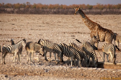 Przejazd do największego w Namibii parku narodowego – PN Etoszy. Popołudniowe safari po parku. Żyje tutaj 114 gatunków ssaków i 340 gatunków ptaków! W sercu Parku Narodowego Etoszy leży słone jezioro. W porze deszczowej zasilane jest rzekami Ekuma i Oshigambo, a w suchej pokrywa się skorupami solnymi. Ludy zamieszkujące te okolice – Owambo, Hererowie, Buszmeni – nazywali je „jeziorem miraży” lub „miejscem, gdzie woda jest sucha”. W poszukiwaniu wody i pokarmu przemierzają te tereny olbrzymie stada antylop i zebr, żyrafy i słonie oraz idące ich tropem drapieżniki: lwy, hieny, gepardy, likaony. Wieczorem będziemy mieć możliwość na dalsze obserwacje dzikich zwierząt przychodzących do oświetlonych wodopojów.